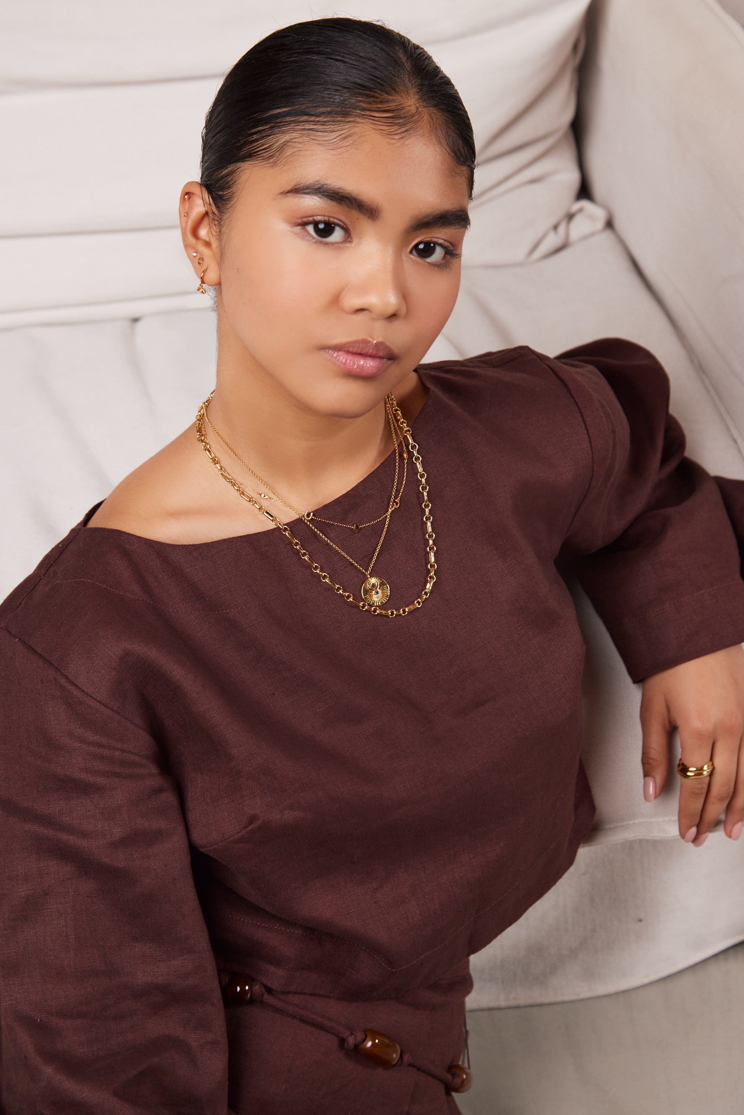 - Add your collar length necklace, we love our we love our Dainty T-Bar Knot Necklace for this.