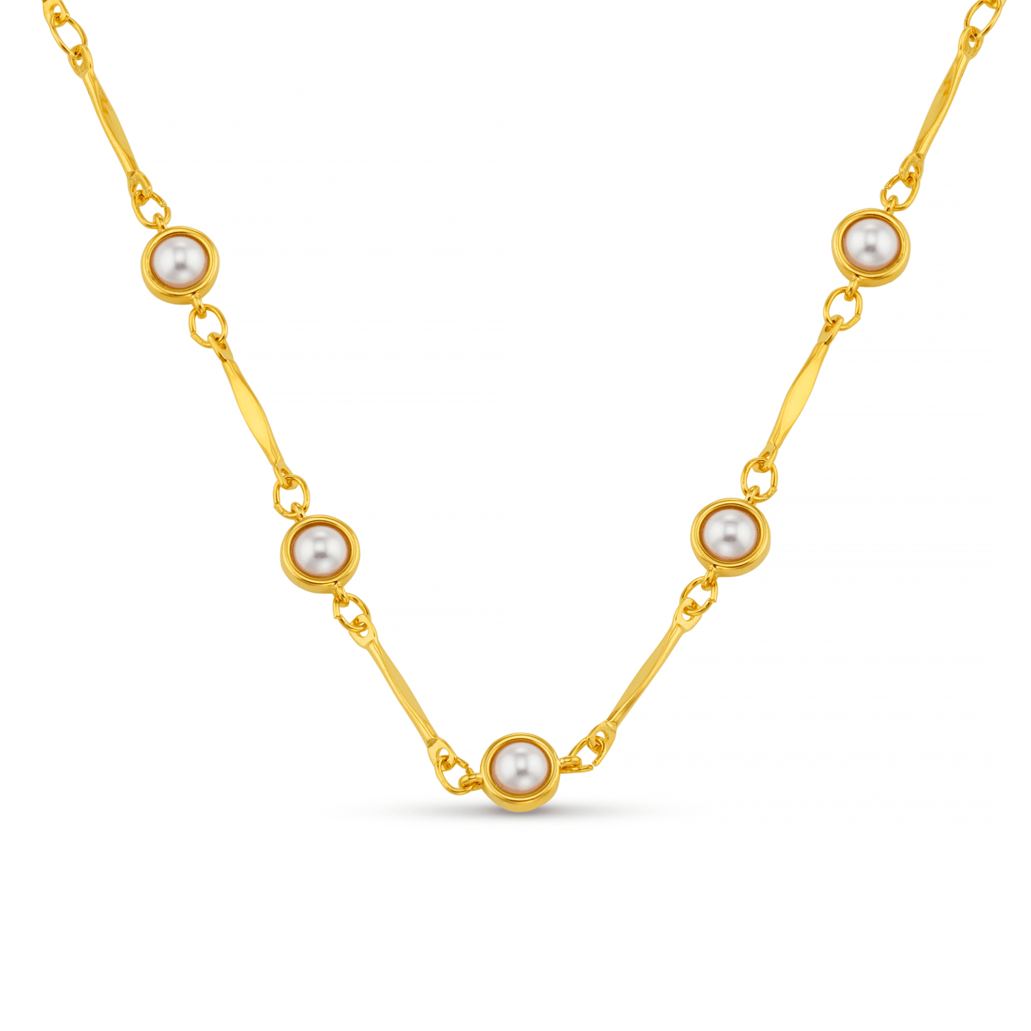 Delicate yet impactful, the Bar Link & Stationed Pearl Necklace. Featuring a sleek bar link chain accented with five evenly stationed pearls, this piece offers a refined take on classic pearl styling.