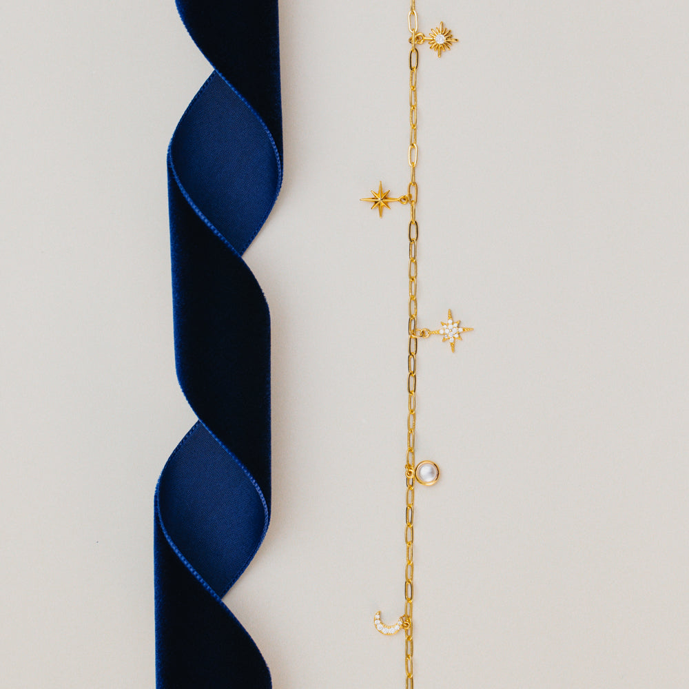 Bring a touch of starlight to your everyday look with the Celestial Multi Charm Rope Necklace. Seven dainty celestial charms spaced across a wearable everyday chain, long enough to still make a statement.