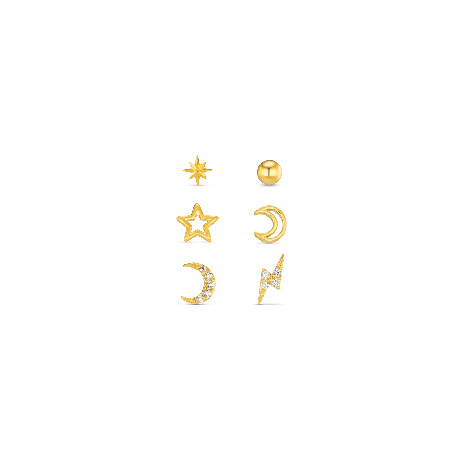 Mix & match your studs with our Celestial Stud 6 Pack Ear Party in Gold. Featuring moons, a star, lightning bolt, starburst and classic ball stud, these celestial stud earrings can be worn with anything.