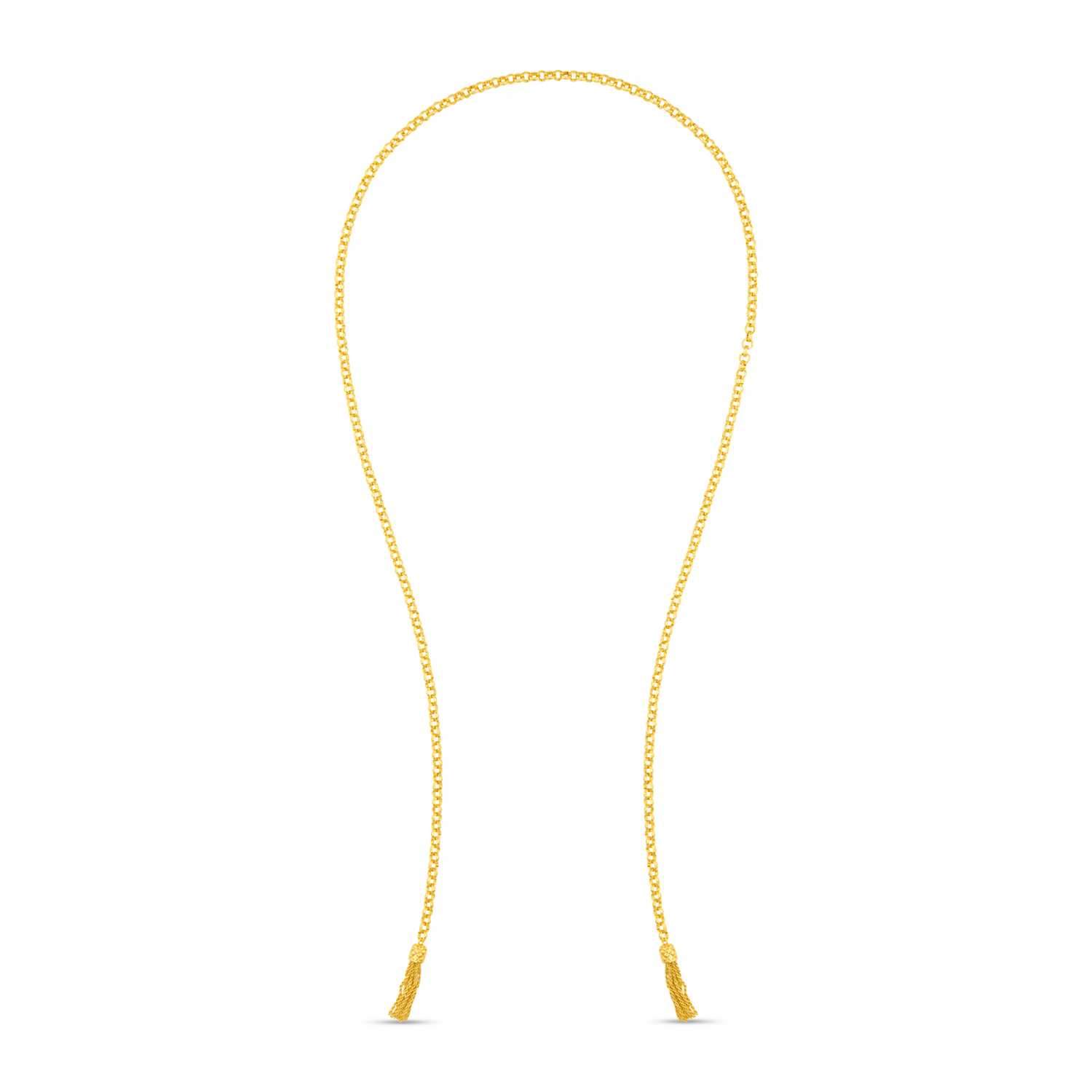 Featuring a long gold chain with two drop tassels, that can be tied centrally at any length, perfect for that special occasion.