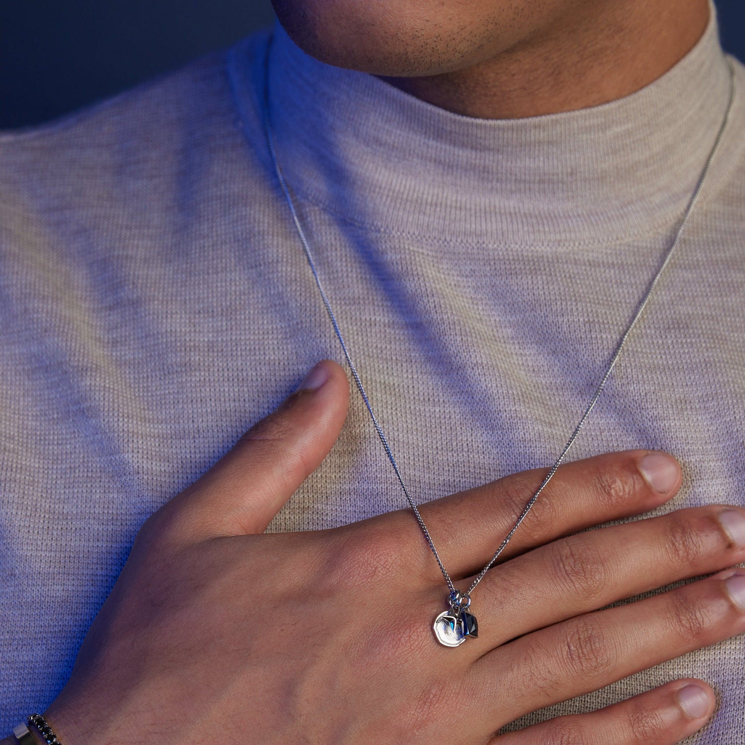 Featuring a simple silver chain holding three charms, a starburst shape, a medallion coin & a rectangular blue cubic zirconia stone.
