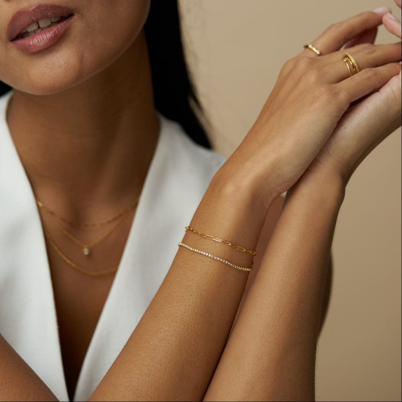 This duo features a soft shimmer of petite crystals paired with the sleek simplicity of a delicate chain bracelet. Designed to elevate both everyday outfits and evening looks, it’s the ultimate layering essential.