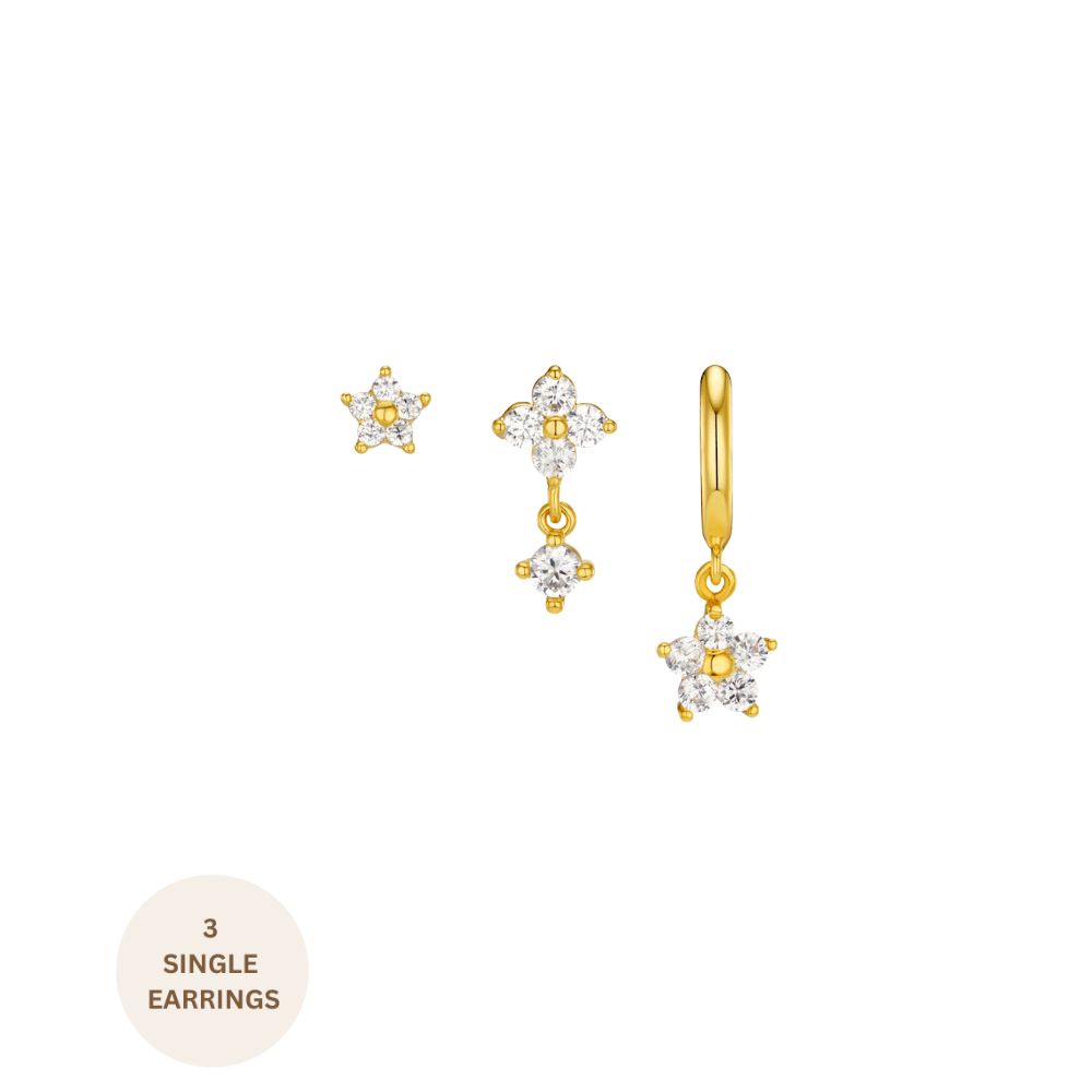 The Crystal Flower Ear Stacking Set adds a fresh, spring-inspired touch to our mix & match collection. It features three crystal floral earrings, in both a hoop and duel stud designs. Create a custom ear stack and wear them interchangeably, combine them for your perfect stack, or style one ear with a contrasting stack for a unique look.