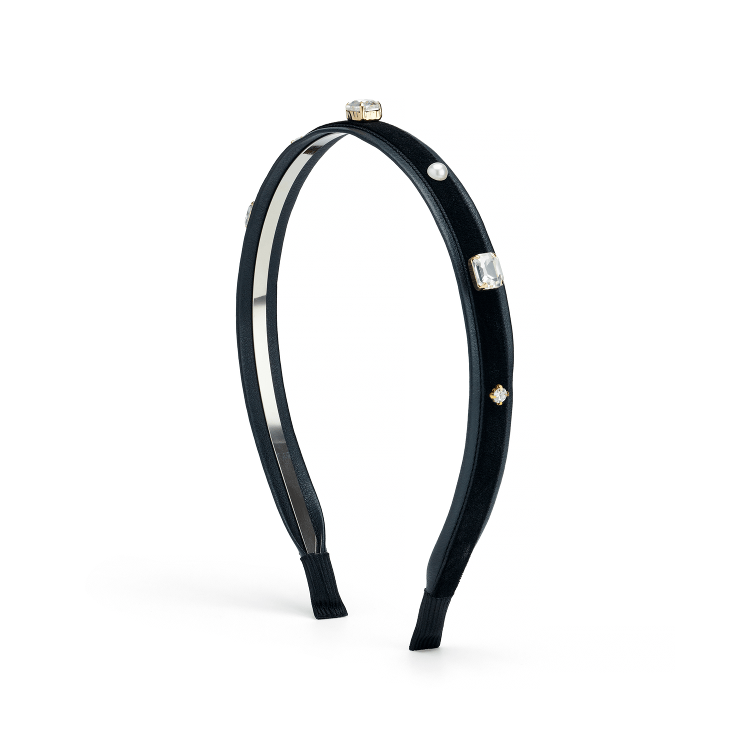Featuring a velvet black headband, with faux pearl and crystal embellishments on it.