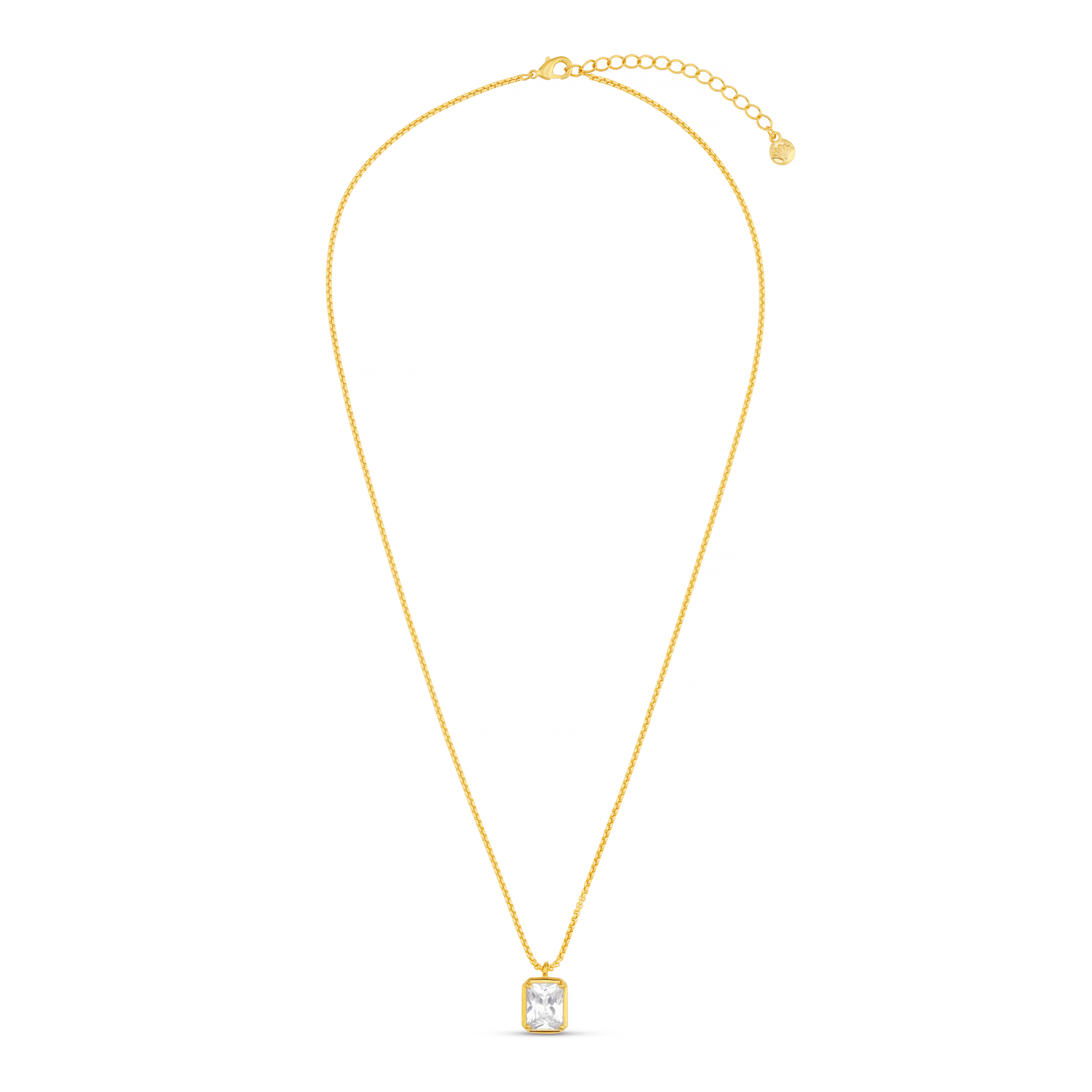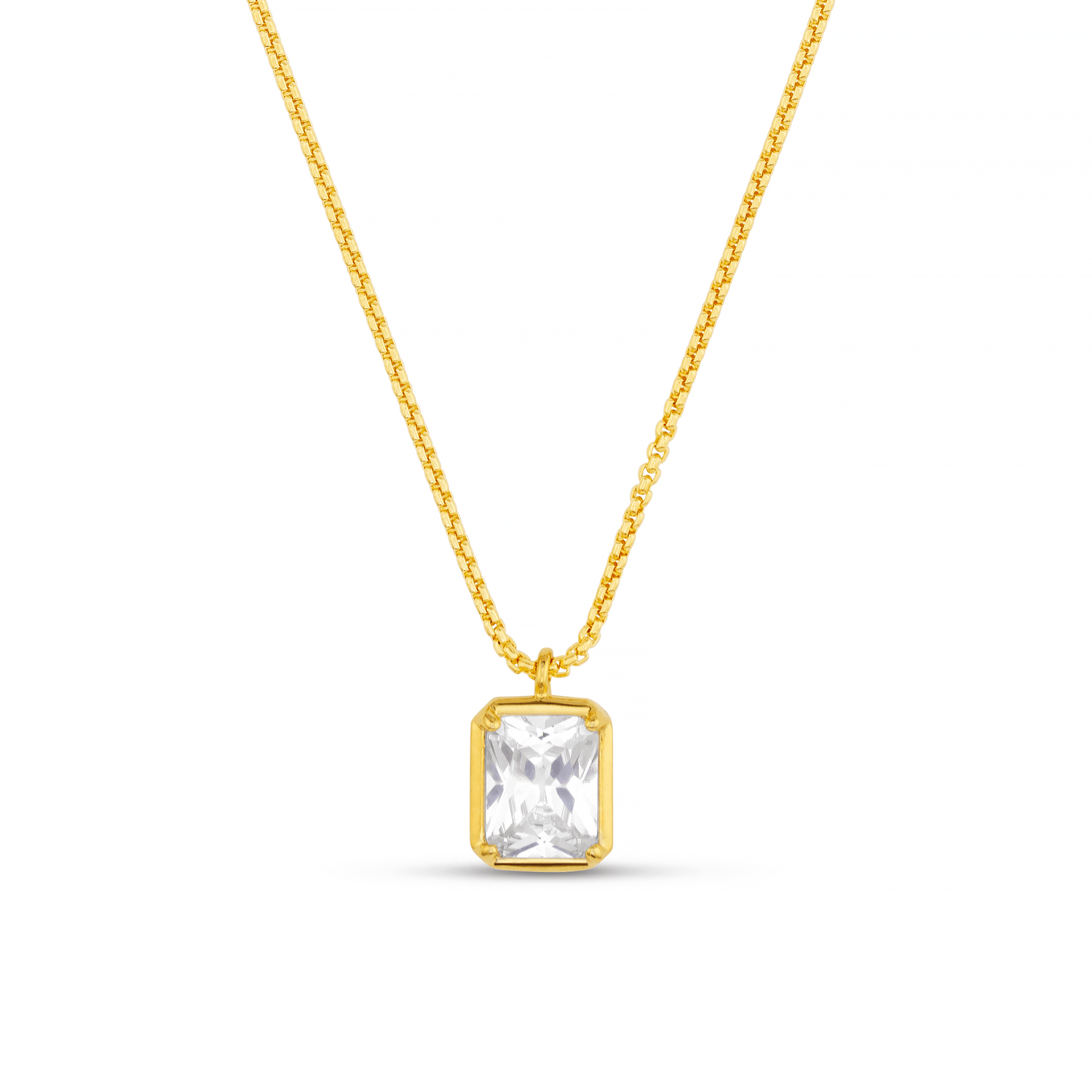 Featuring a gold rope chain holding a large square cubic zirconia crystal, this necklace will glam up any outfit.