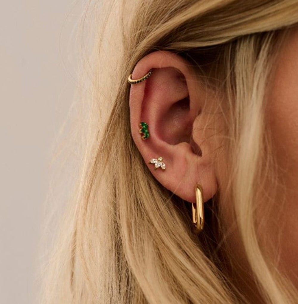 Featuring a gorgeous row of emerald pave cubic zirconia stones on a simple gold piercing clicker hoop earring.