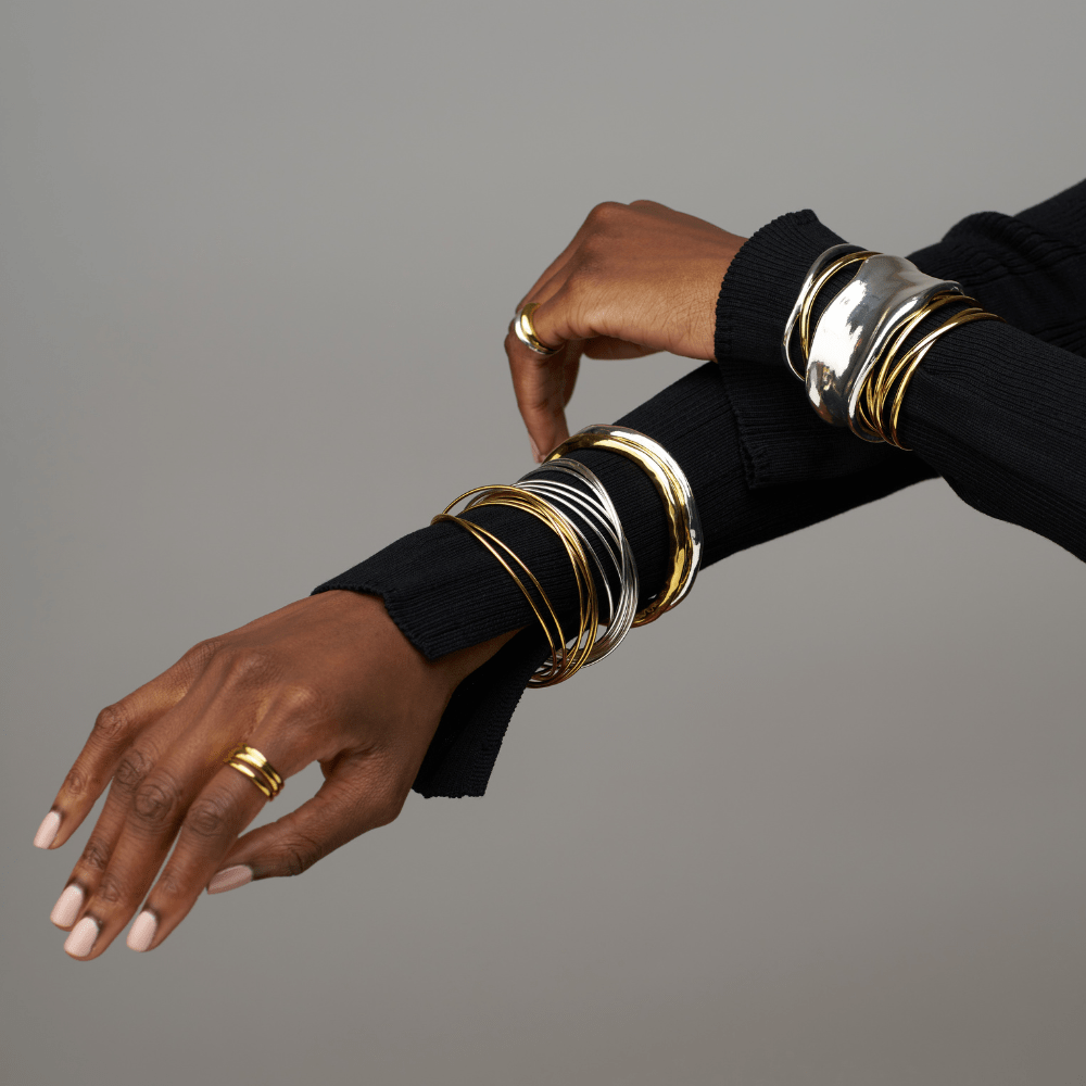 The Fine Multi Interlocking Bangles feature a set of delicately crafted bangles that interlock seamlessly for a chic, layered look.