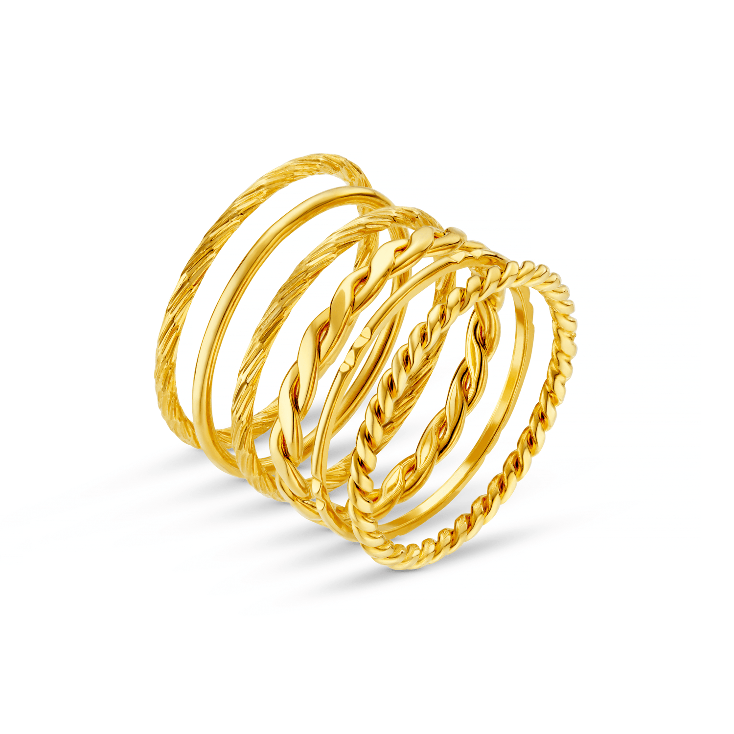 Featuring six gold thin stackable rings with different unique textures, these are perfect to include in your existing ring stacks or worn alone for a subtle look.