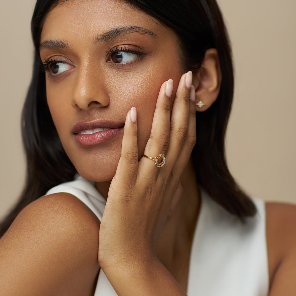 The bold yet elegant, Interlocking Pavé Open Circle Ring, features an interlocking open circle design, encrusted with dazzling pavé crystals. Pair alongside fine gold bands, and a chic earring, allowing this ring to shine as the focal point.