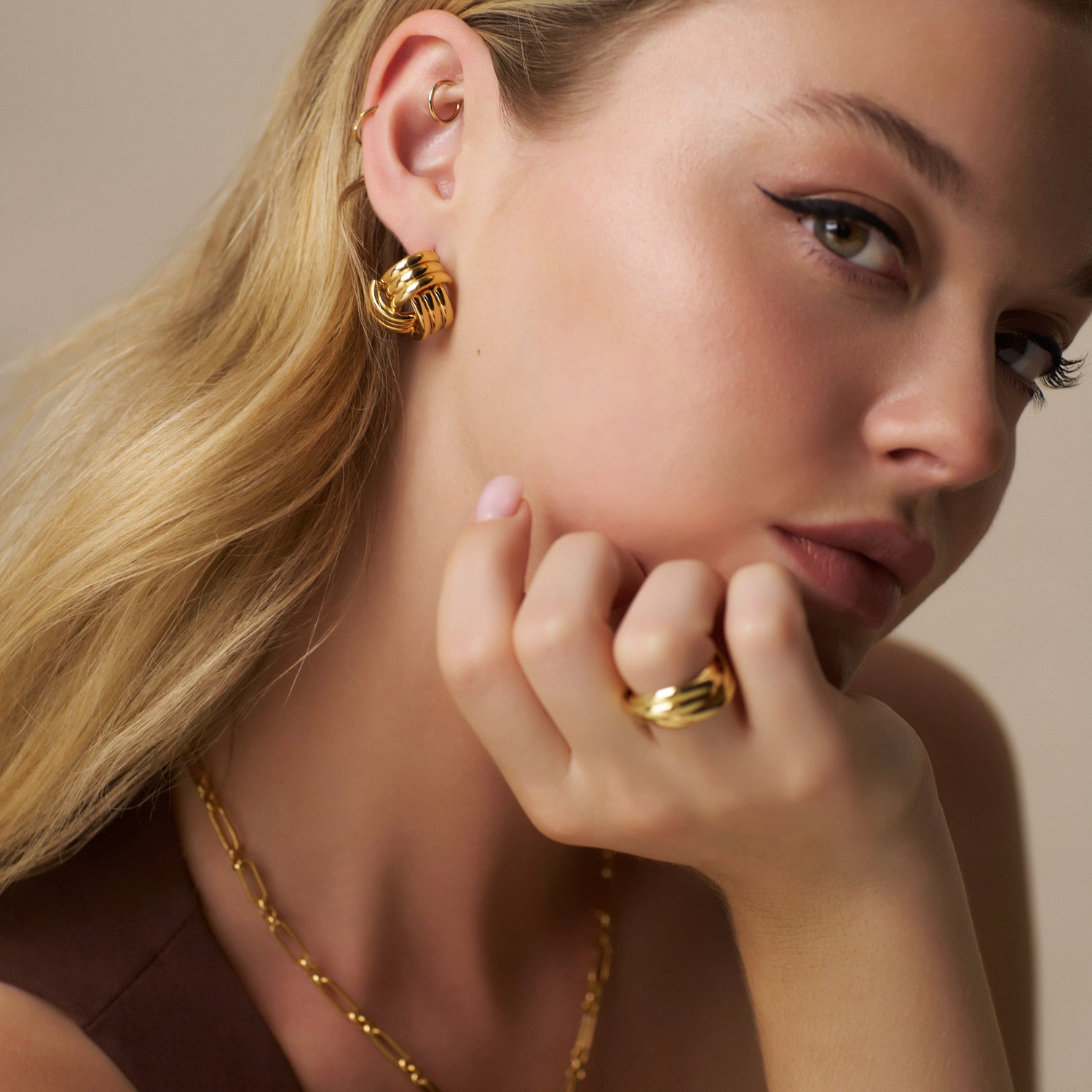 Sculptural and striking, the Interlocking Statement Stud Earrings feature bold, linear curves, intertwined in a sleek, silhouette. With their refined shape and high-shine finish, these studs offer the drama of a statement earring with the ease of an everyday piece.