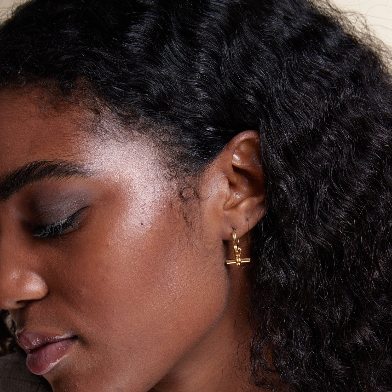 A customer favourite, now updated. The LUXE Linear T-Bar Drop Hoop Earrings in Gold add a linear detail to your look, with a luxe finish. Featuring a gold huggie hoop earring with a T-bar drop. Simply detach the t-bar for a simple classic hoop.