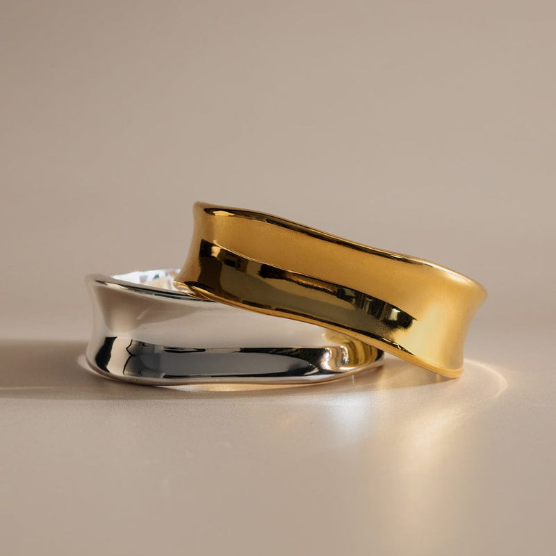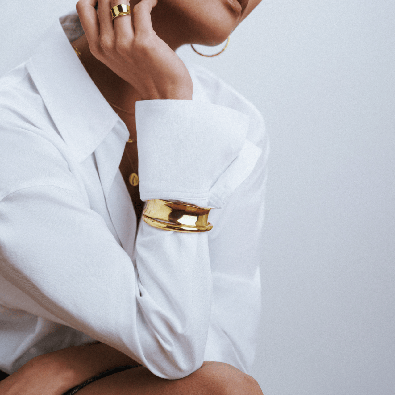 A sleek and modern bangle with a polished molten finish. Waterproof and durable, the LUXE Polished Molten Bangle is perfect for everyday wear. Worn over a shirt for the office or solo for evening looks, this piece has the power to become a wardrobe essential.