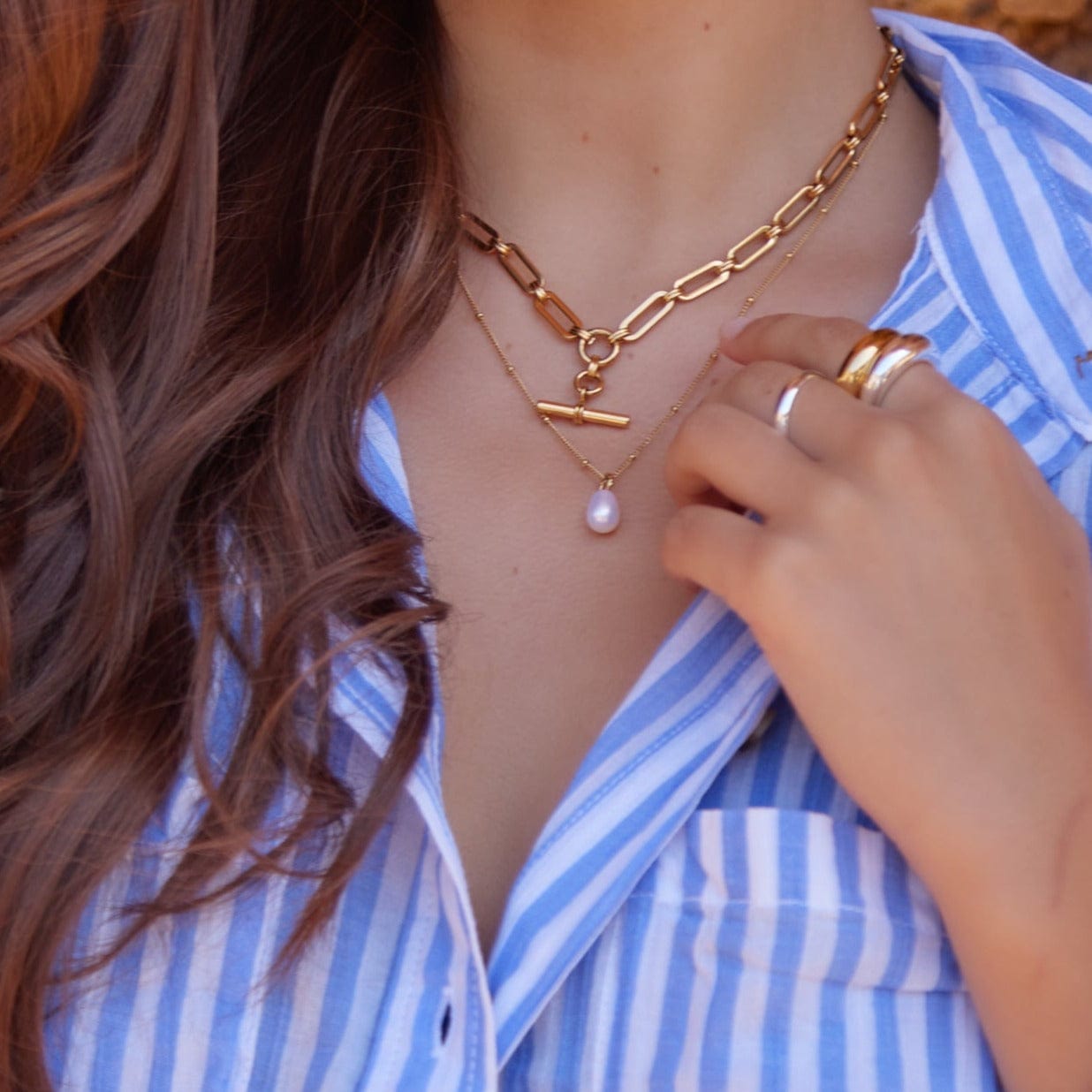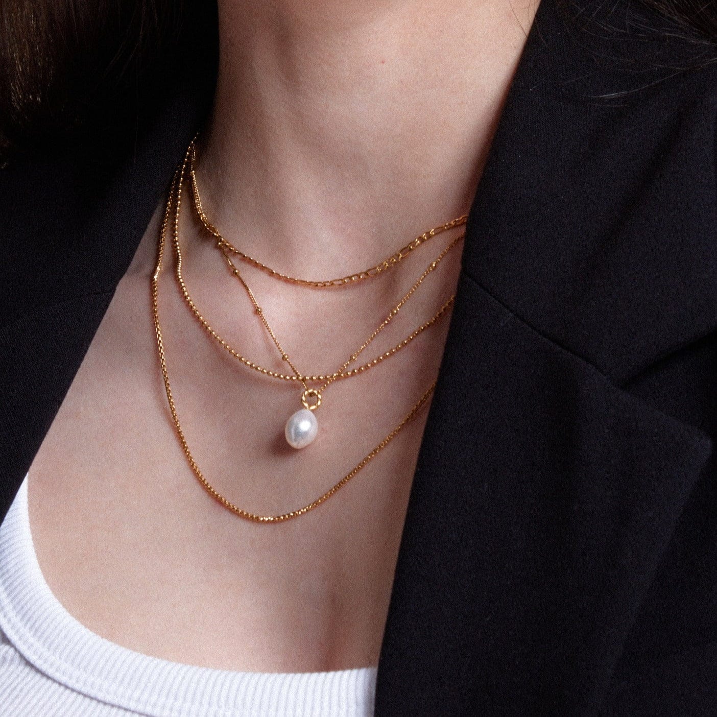 Our luxury take on a classic, the LUXE Pearl Satellite Necklace is waterproof & made with recycled materials. Featuring a dainty satellite style chain holding a gorgeous timeless freshwater pearl.