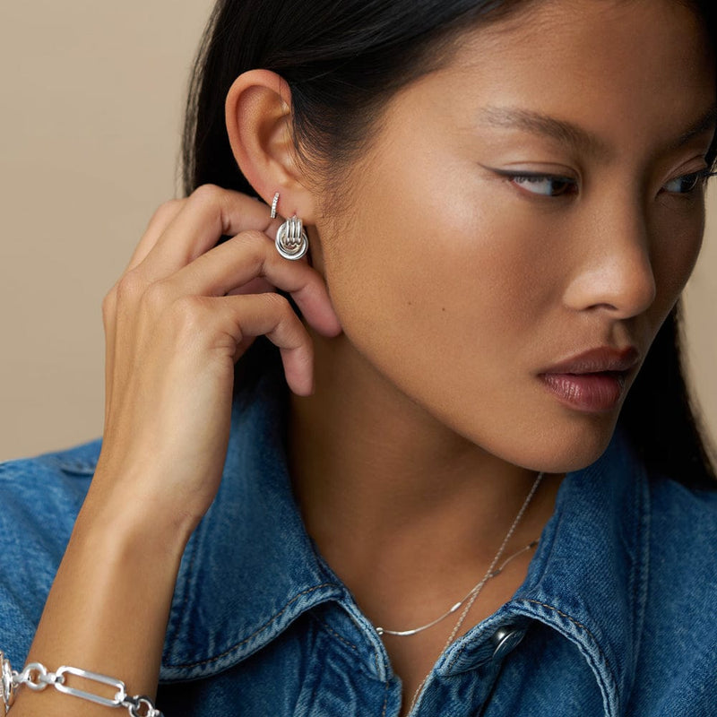 Clean, polished, and effortlessly chic. The Mini Polished Interlocking Earrings in Silver combine simple geometry with a subtle interlocking detail for a modern, minimalist look.