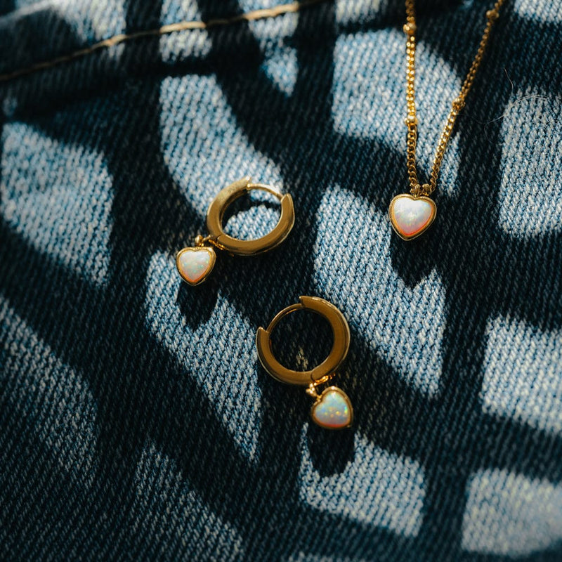Clean huggie hoops with a delicate opal heart drop. The Opal Heart Drop Huggie Hoop Earrings provide understated elegance with a touch of romantic flair.