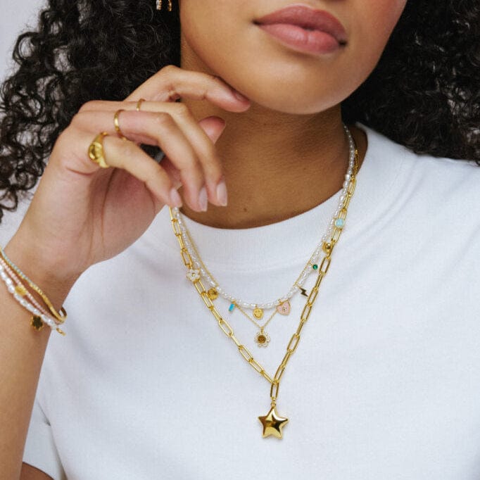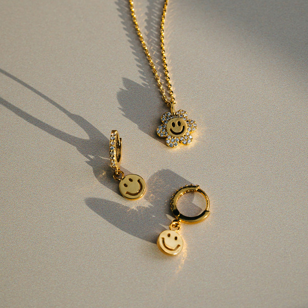 The Pavé Flower Happy Face Charm Necklace, features a cheerful smiley face charm adorned with shimmering pavé stones. Bringing a fun and playful, yet polished touch to your everyday style and a little positivity to those who admire.