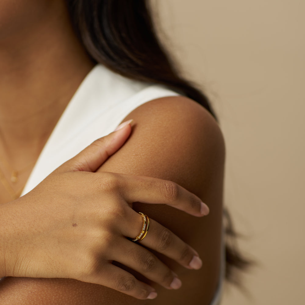 This Pavé Star Stationed 2-Row Adjustable Ring, blends simplicity with chic style, offering the layered effect of two rings. Striking the perfect balance, this design pairs a sleek plain band with a star-accented pavé side. Adjustable, to allow endless combinations, from stacking to be able to wear on each finger.