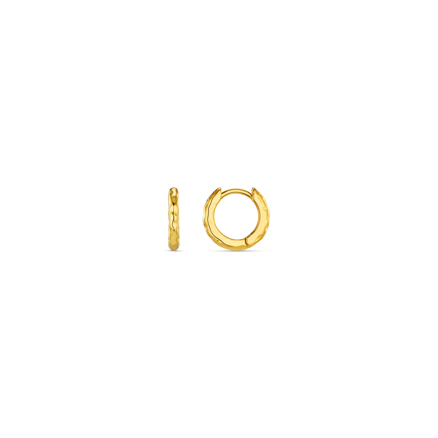 Featuring a gold molten textured huggie hoop earring with a clip clasp.