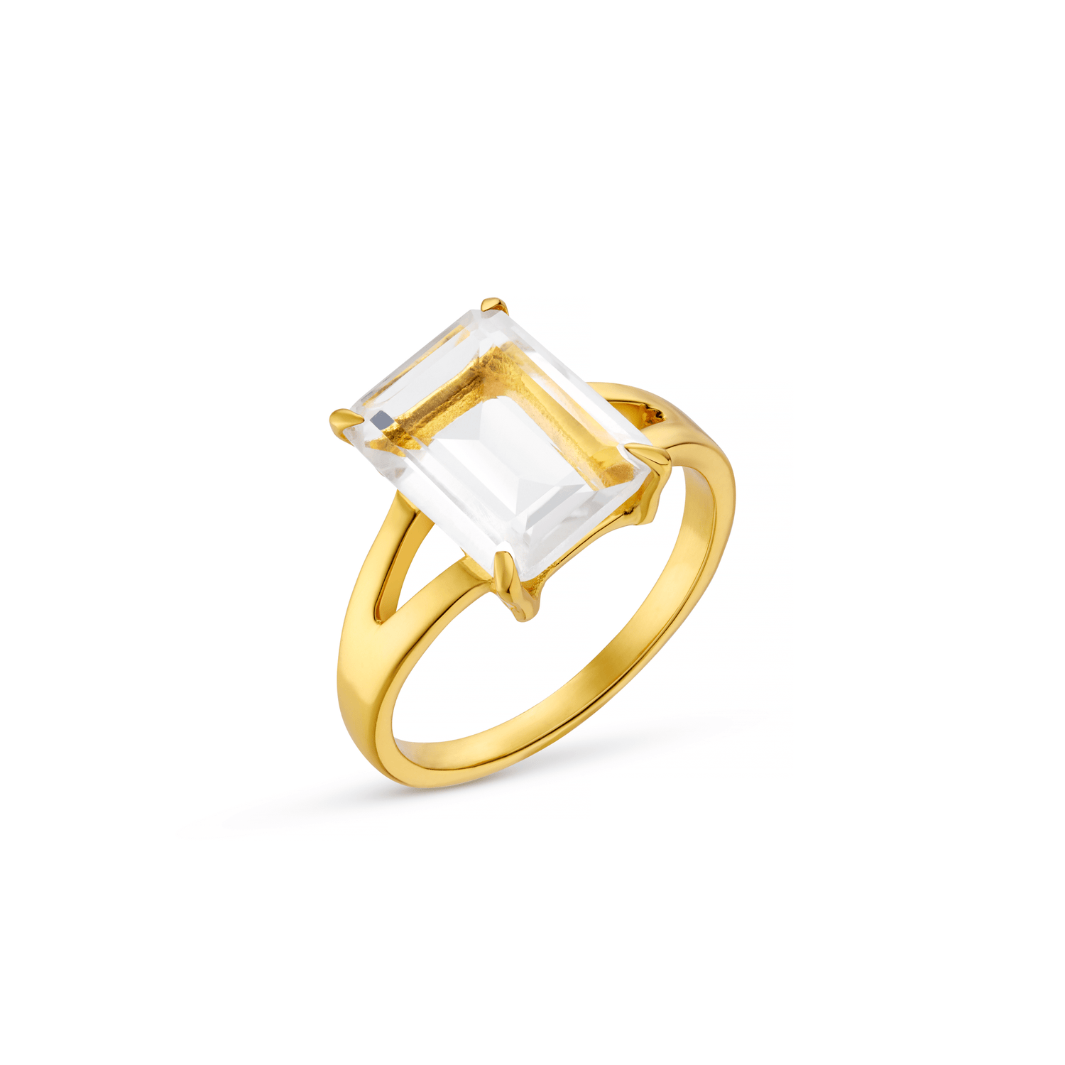 Featuring a translucent semi precious quartz on a gold claw attached to simple band.
