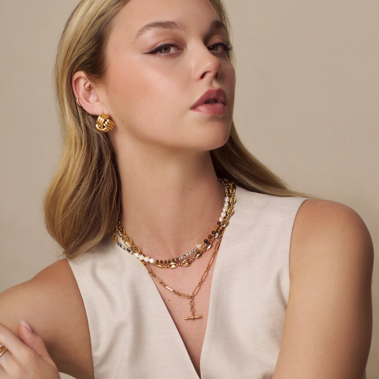 A blend of precisely positioned mixed toned semi-precious beads, a touch of gold and fresh-water pearls. Varying in size, texture and colour, the beads come together to create an eye-catching necklace that sits delicately on the collarbone.