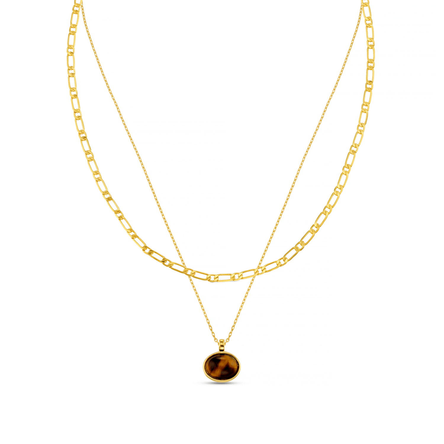 This set pairs the Semi-Precious Tigers Eye Pendant Necklace with the classic Figaro Chain. A statement in balance, earthy yet elevated. The perfect duo for the transitioning season, with the rich golden depths of Tiger’s Eye, and easy to wear layering chain.