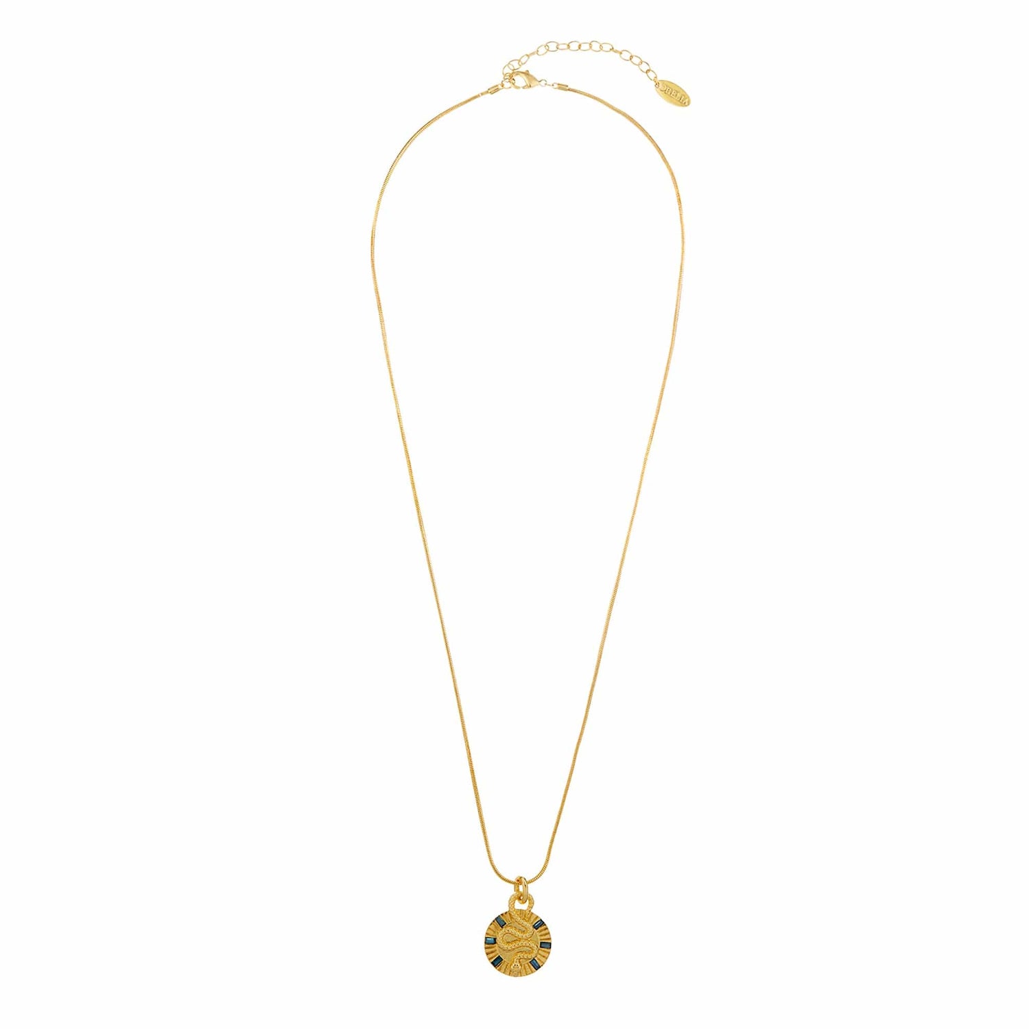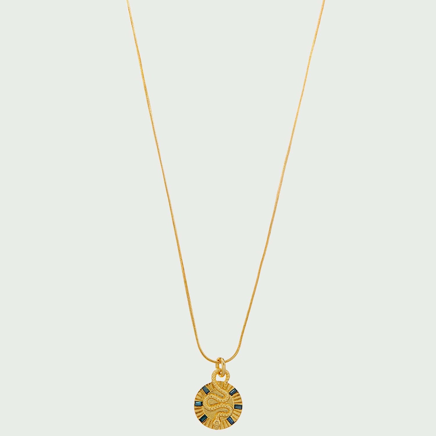 Featuring baguette cut & round montana Swarovski crystals on a gold disc with snake charm, attached with a design detail of the snake coiling around to attach the coin & chain as one.