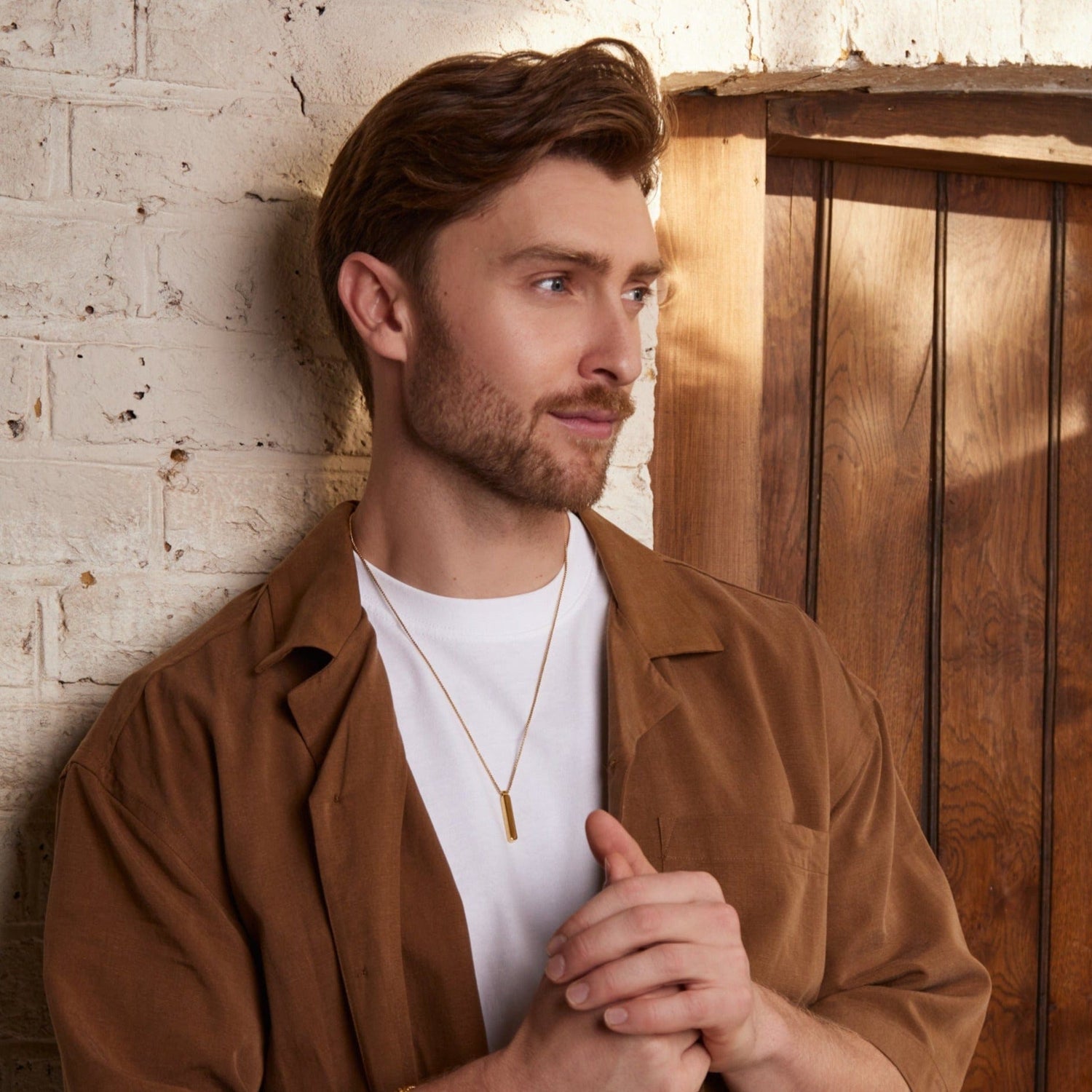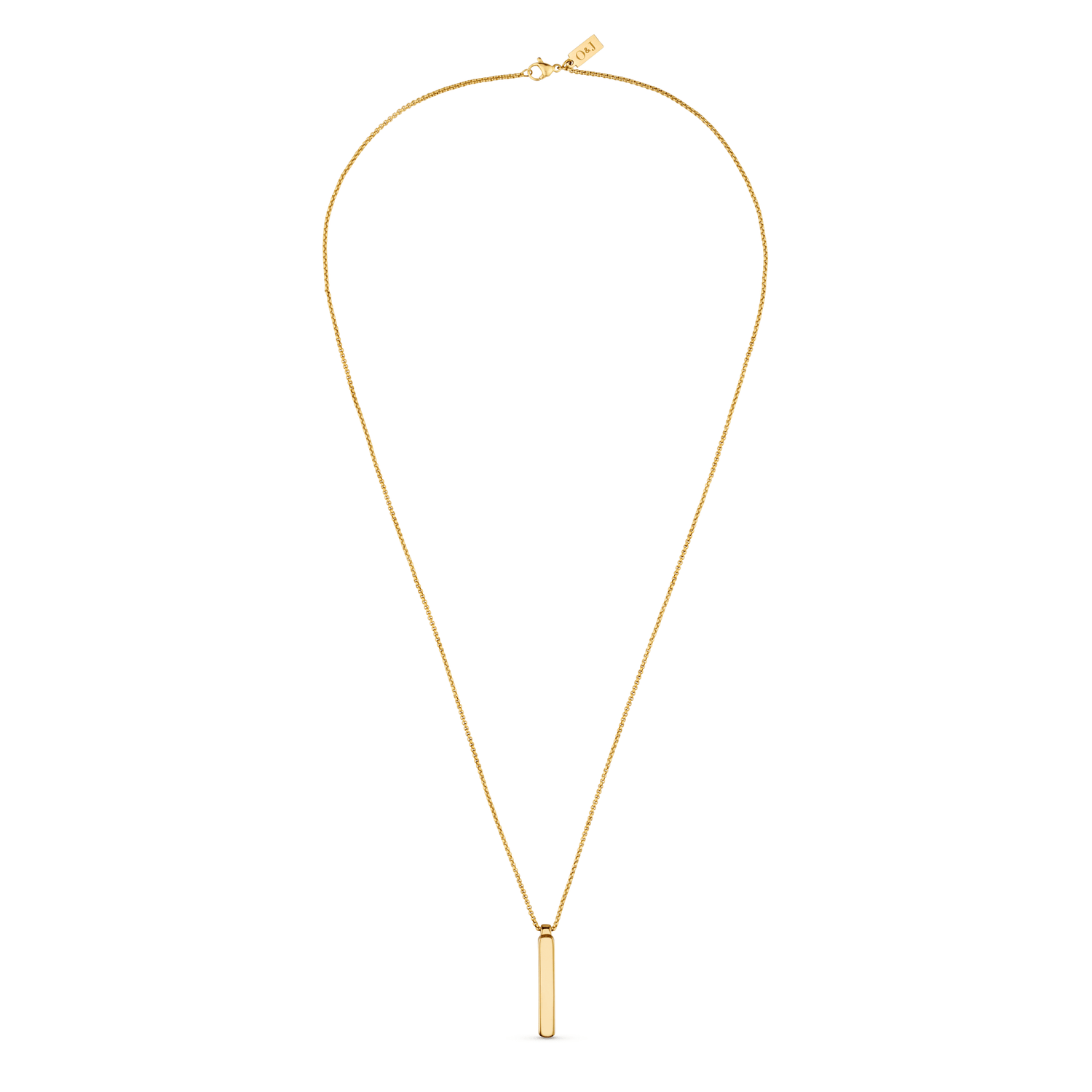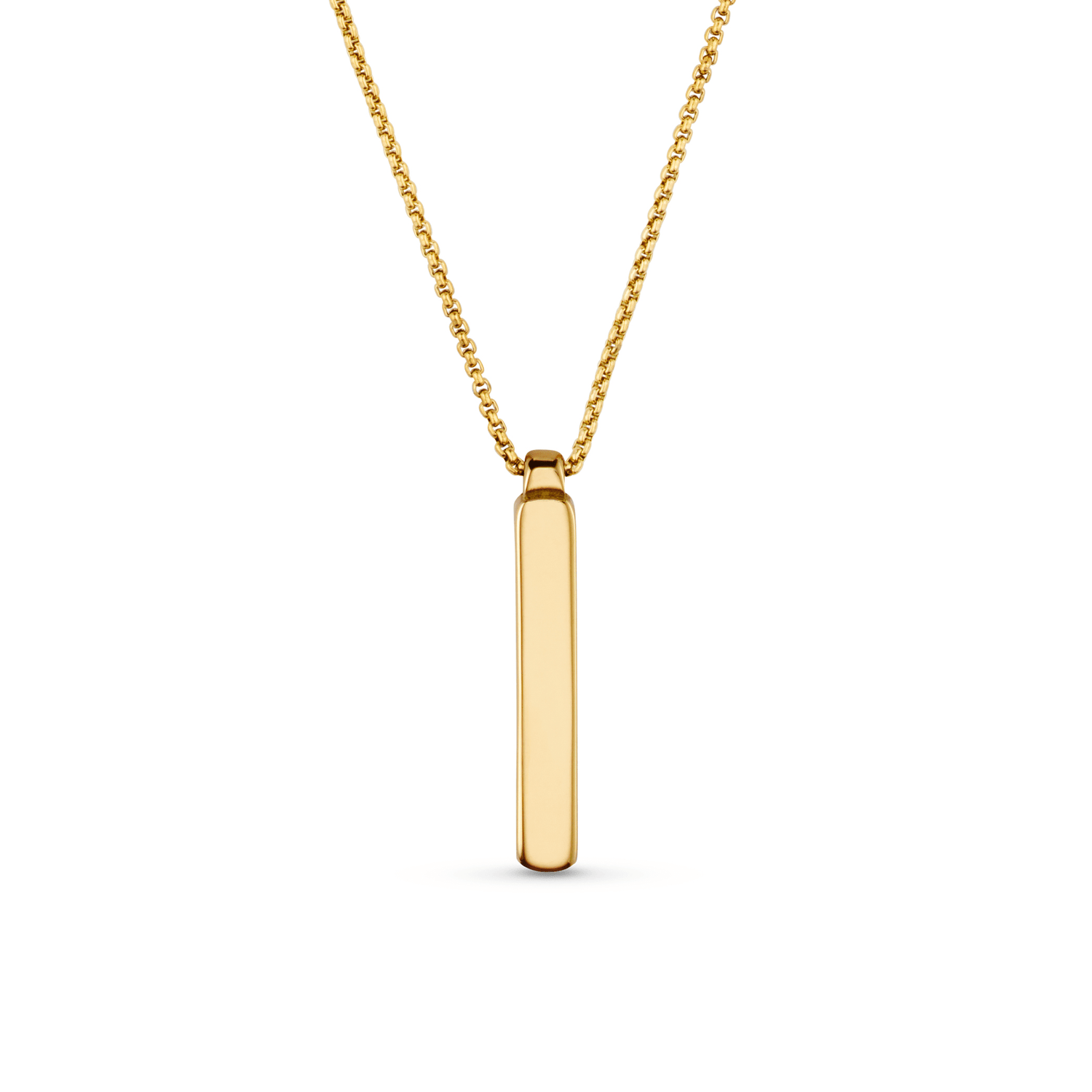 Featuring a gold plated bar pendant, which can be engraved on a classic chain.