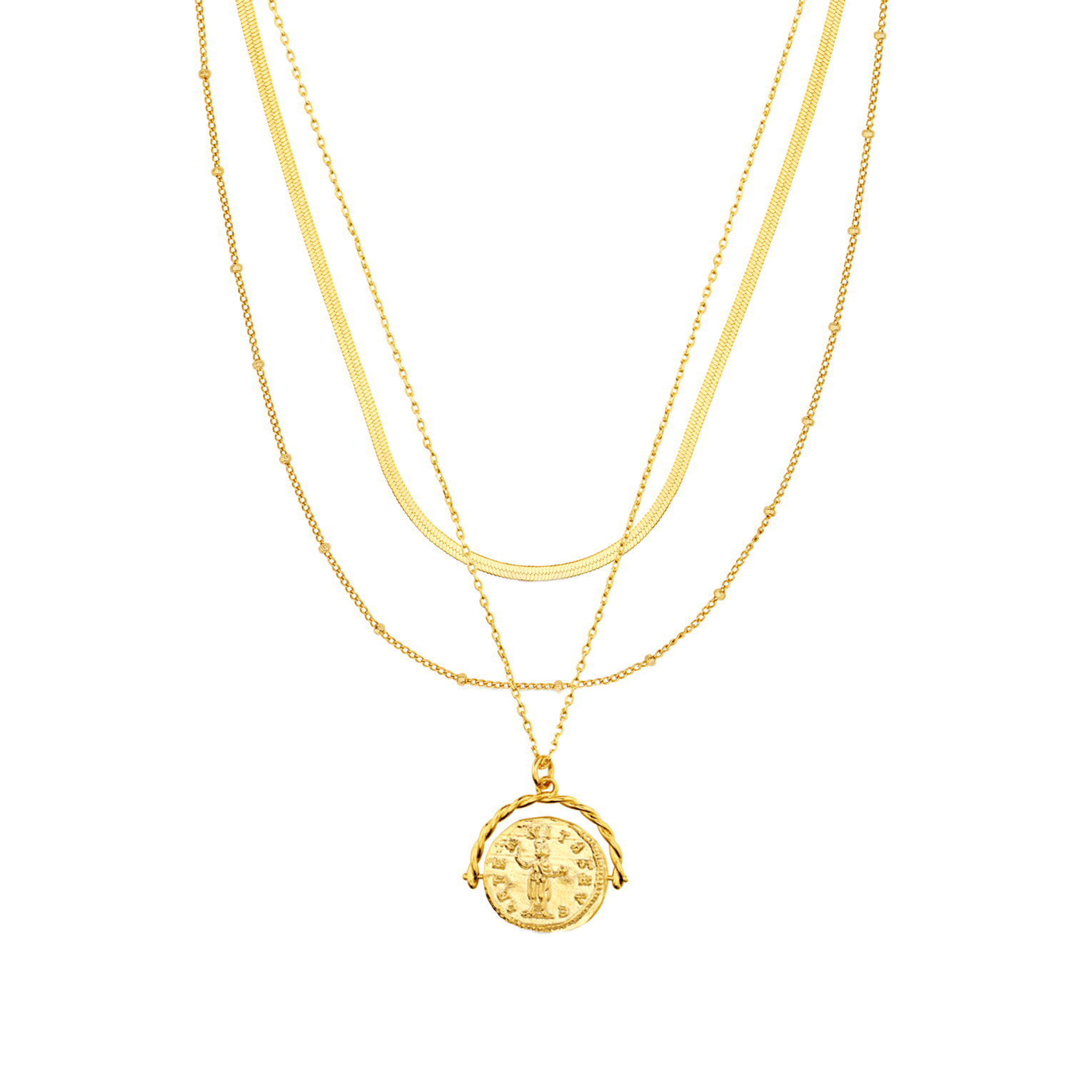 Two of our bestsellers, but together: The Satellite & Snake Layered Necklace with the Coin Spinner Necklace.