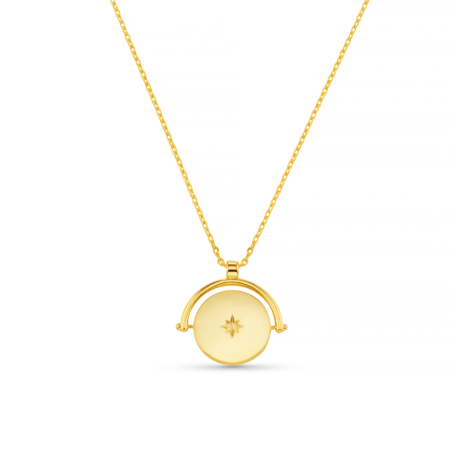 Add a touch of celestial charm to your jewellery collection with the Gold Starburst Coin Spinner Necklace. Featuring a polished coin pendant etched with a radiant starburst design, its spinner detail adding dynamic movement.