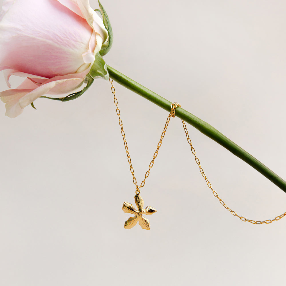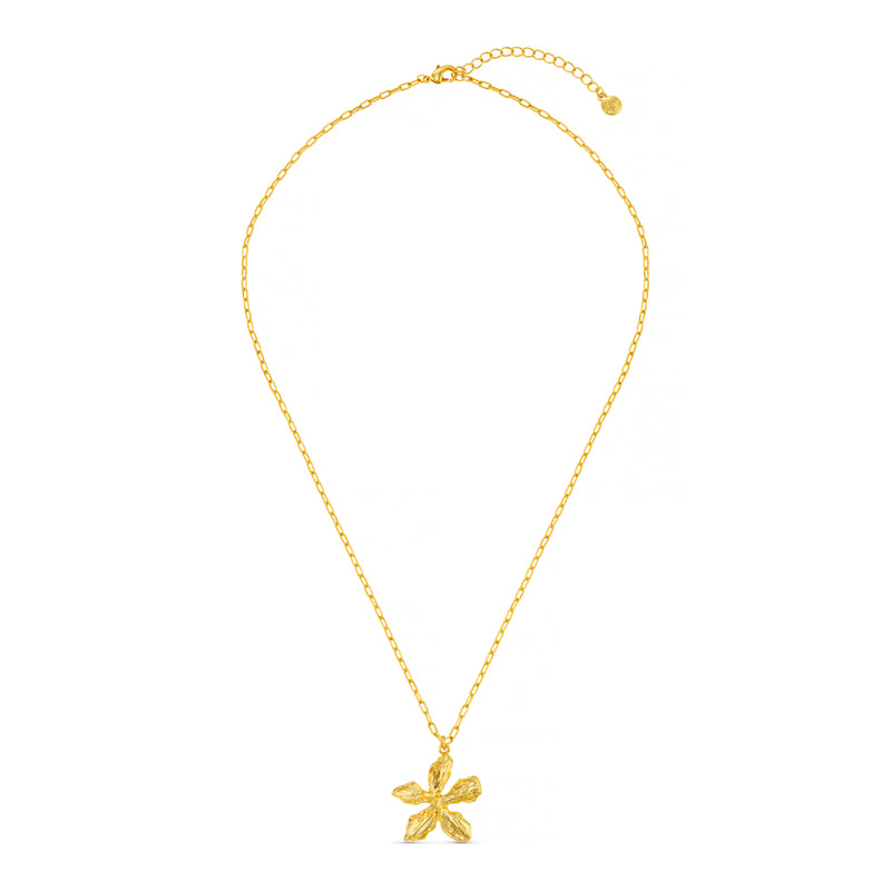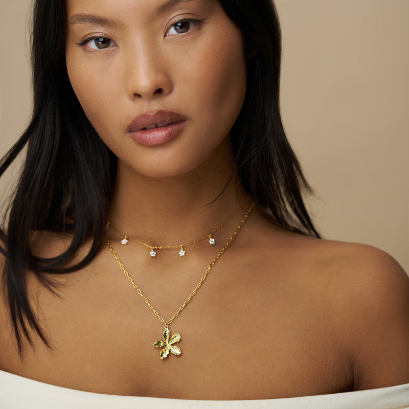 The ultimate spring statement. The Statement Metal Flower Necklace has an irregular petal shape and etched detail texture, that compliments the simplest of chain necklaces or other pretty pendants, as modelled here.