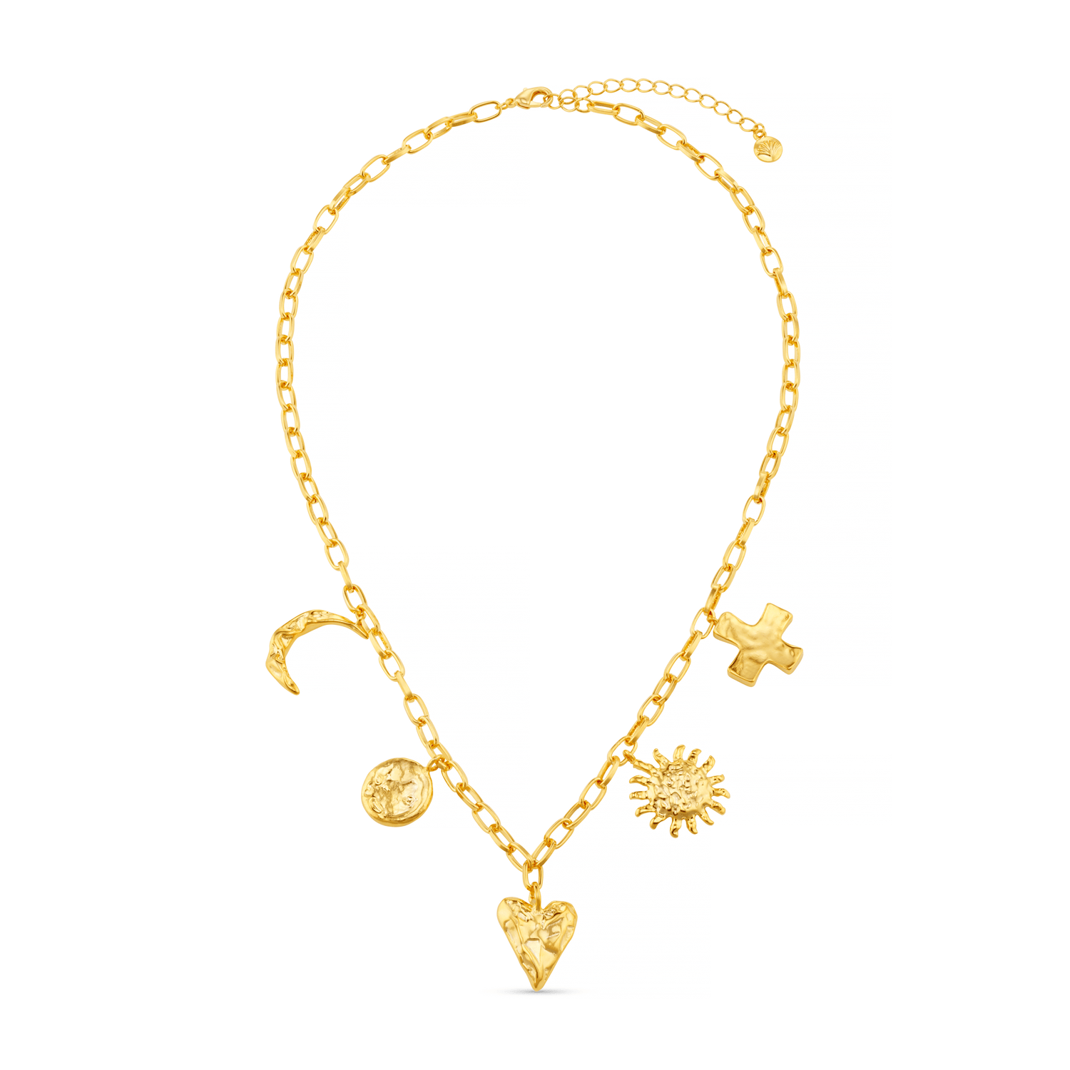 The Statement Molten Charm Necklace features bold, molten effect pendants, set on a polished chain. This eye-catching piece brings texture and shine, while adding a touch of playfulness to your look.
