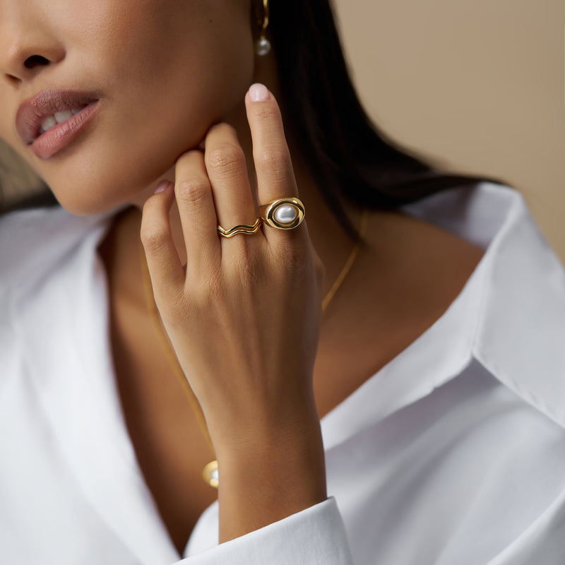 The Statement Molten Pearl Ring features a striking, molten-inspired design crowned with a lustrous pearl. Its organic design and pearl centerpiece bring effortless sophistication from day-to-night styling.