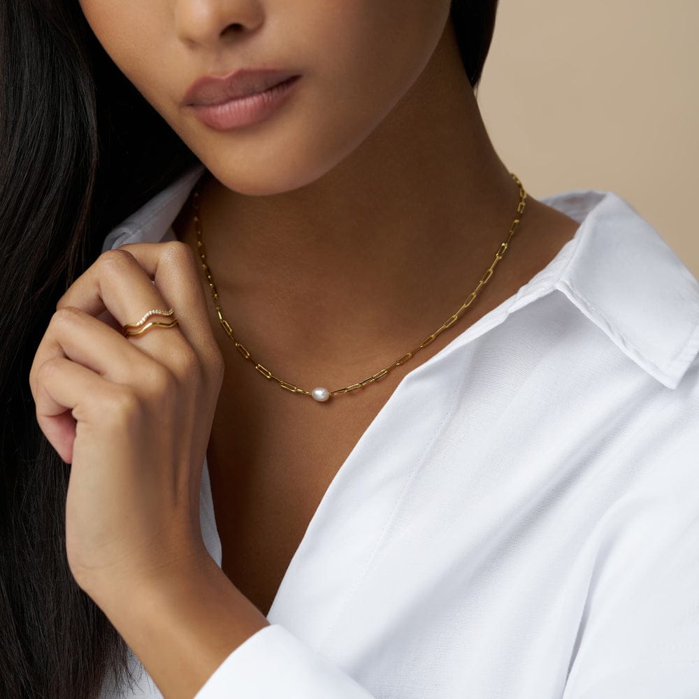 The Stationed Pearl & Chain Link Necklace features a single delicate pearl, stationed in the centre of this delicate link chain. Its clean lines and understated shimmer make it perfect for wearing day to night or office to dinner.