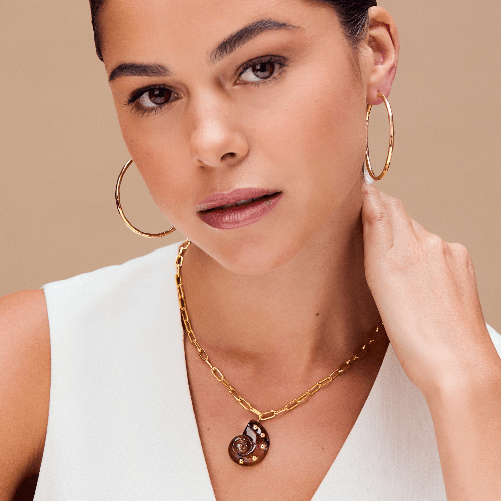 Your classic chain necklace meets summer charm, The Studded Resin Ammonite Necklace is a striking and unique piece, featuring a detailed ammonite pendant crafted from smooth resin and studs accents.