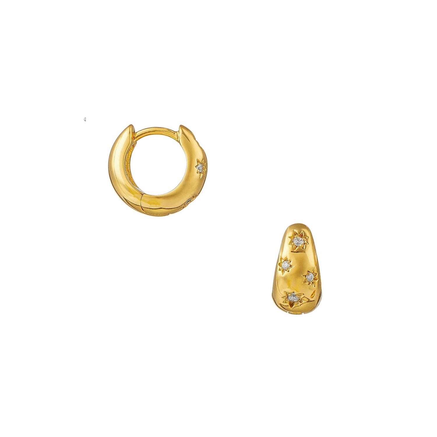 Featuring a chunky gold huggie earring in a tapered style, engraved with starburst shapes & encrusted with clear crystal stones.