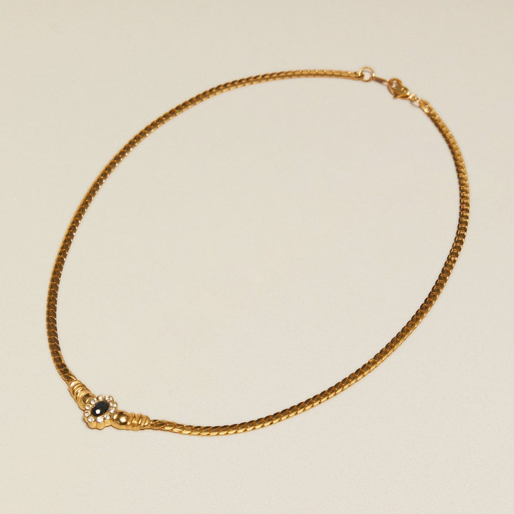 This bold gold chain necklace exudes vintage flair, featuring a striking crystal flower centerpiece accented by a deep black stone.