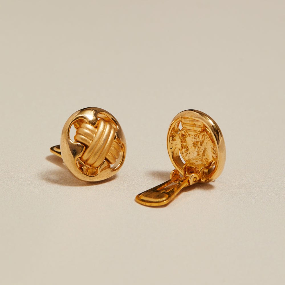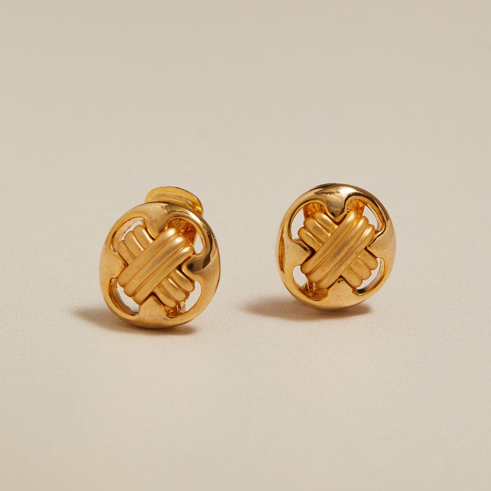 The Vintage Cross Knot Clip-On Earrings, showcase a circular, button inspired design in a polished gold.