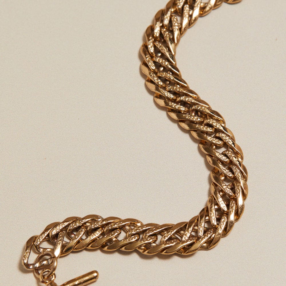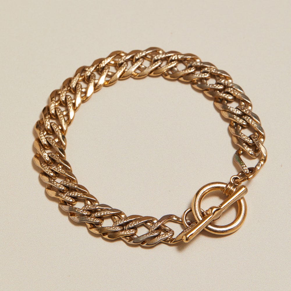 Bold links, classic design, this Vintage Curb T-Bar Bracelet in a worn gold finish, makes a stylish statement.
