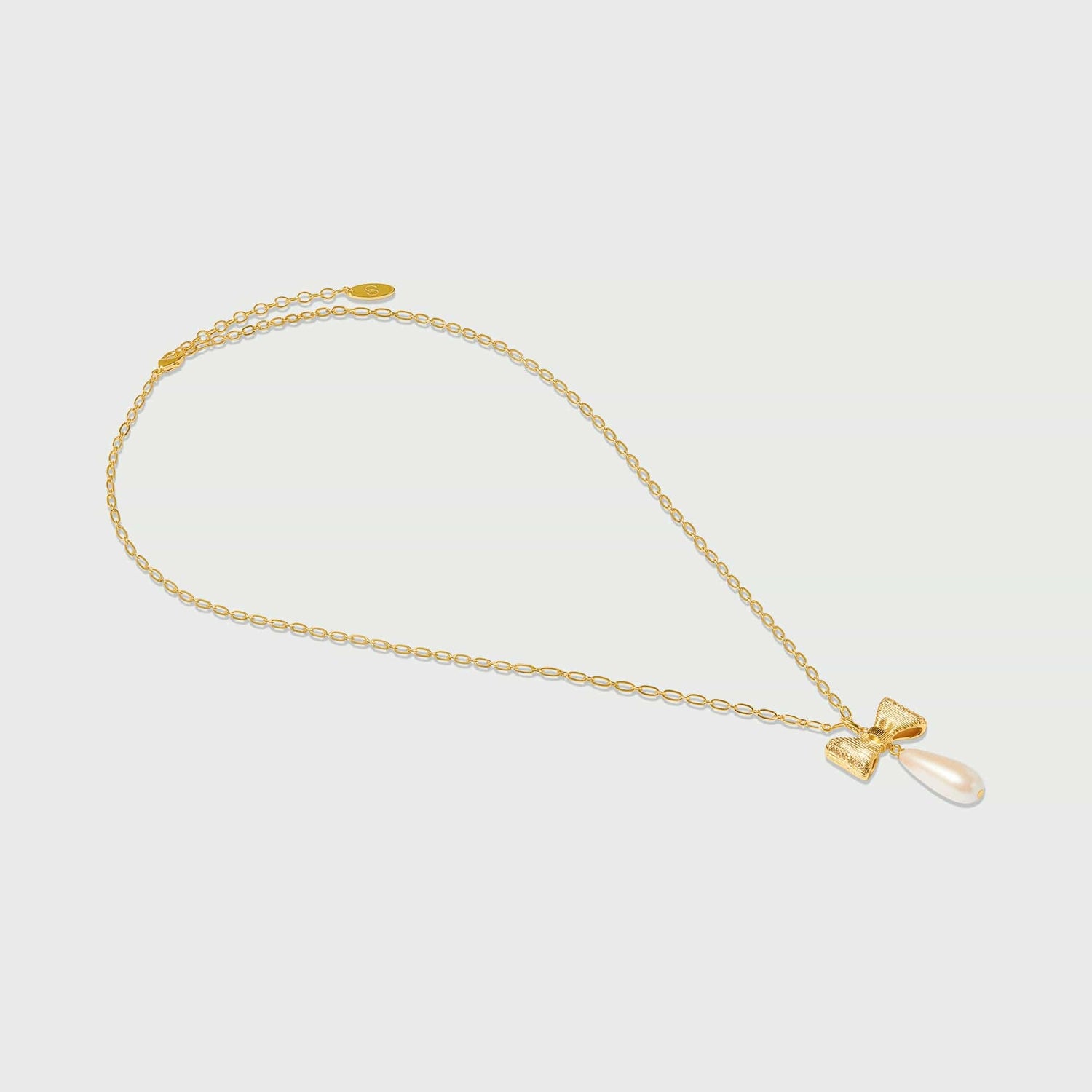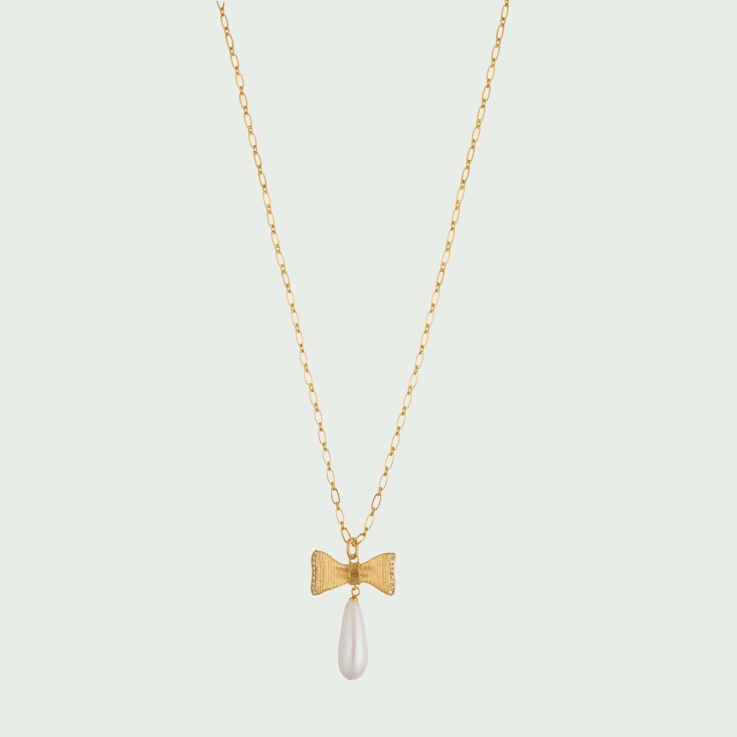 Featuring a rare vintage pear-drop shaped pearl with a lustre finish, sourced by Susan Caplan & embellished with Swarovski® round cut clear crystals on the ridged detail bow charm at the end of a mid-length recycled chain.