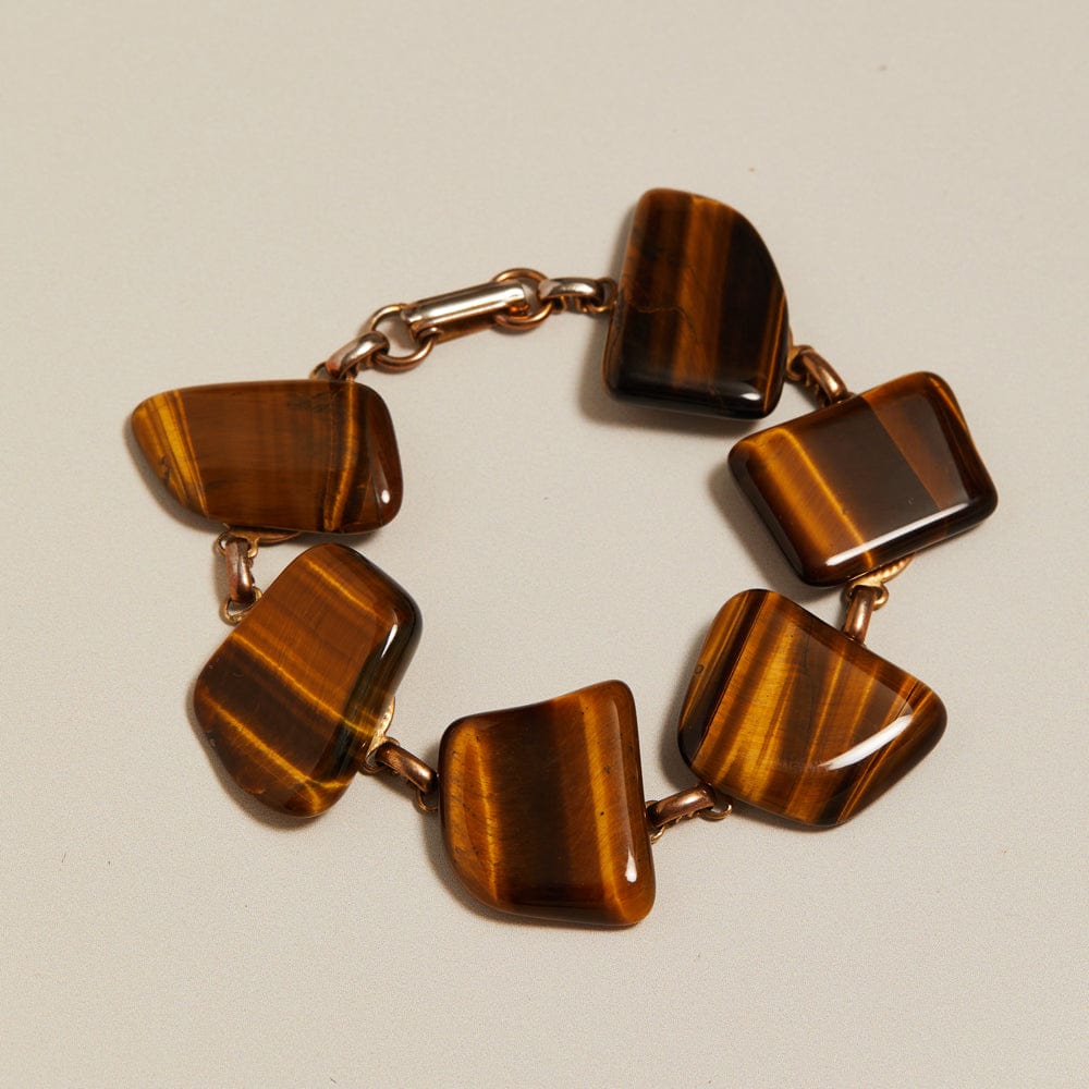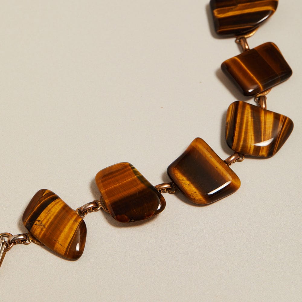 Showcasing the organic irregularity of Tiger's Eye stones, spaced along a simple chain. Six stones lay comfortably on the wrist.