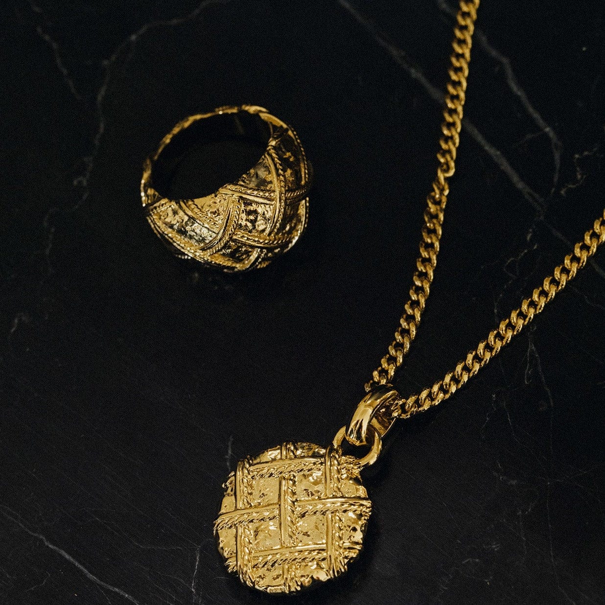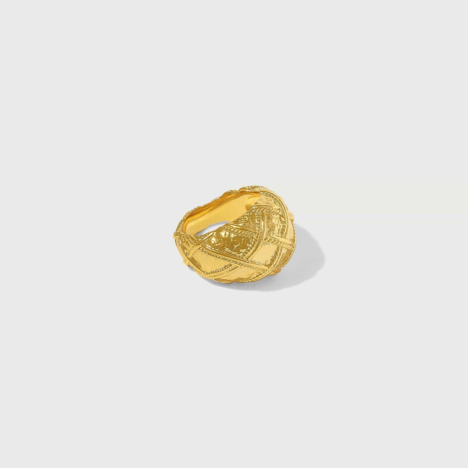 Featuring a chunky domed shaped gold ring inspired by vintage fabrics, engraved with a gorgeous woven rope texture.